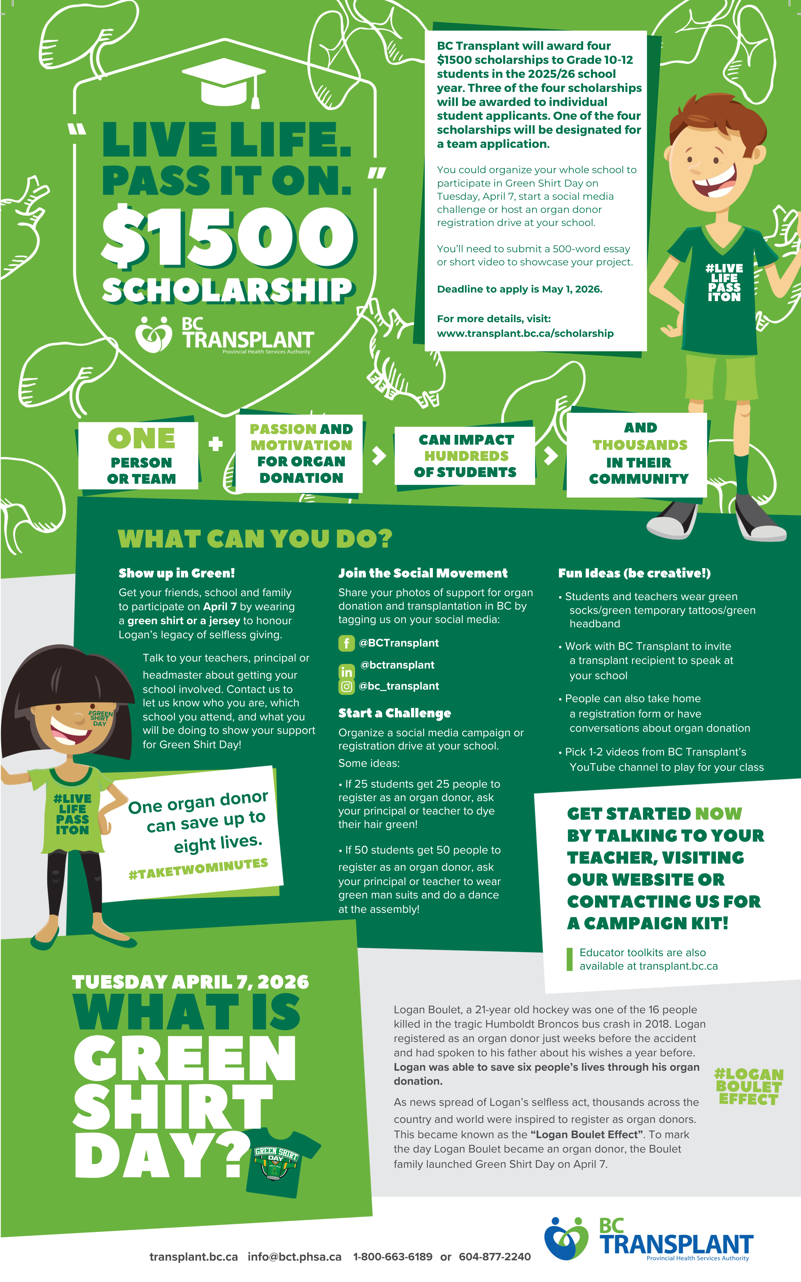 BC Transplant will award four scholarships to grade 10-12 students who lead an organ donation awareness project in their school or community during the 2025/26 school year.